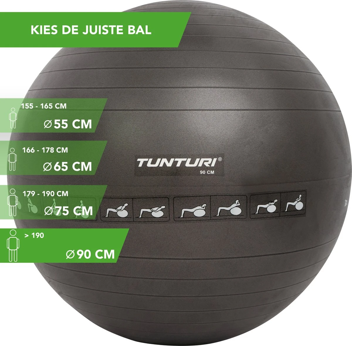 Leuke en uitdagende oefeningen op een bal? Dat kan met de Tunturi Fitnessbal. Belastbaar tot maar liefst 350kg! Je bergt hem na gebruik weer gemakkelijk op omdat hij opblaasbaar is. Hij wordt geleverd met pomp en is verkrijgbaar in verschillende kleuren en afmetingen. Wist je dat het belangrijk is om het juiste formaat aan te schaffen? De grootte van de fitnessbal bepaal je aan de hand van je lichaamslengte. Kies de juiste en daag jezelf uit!