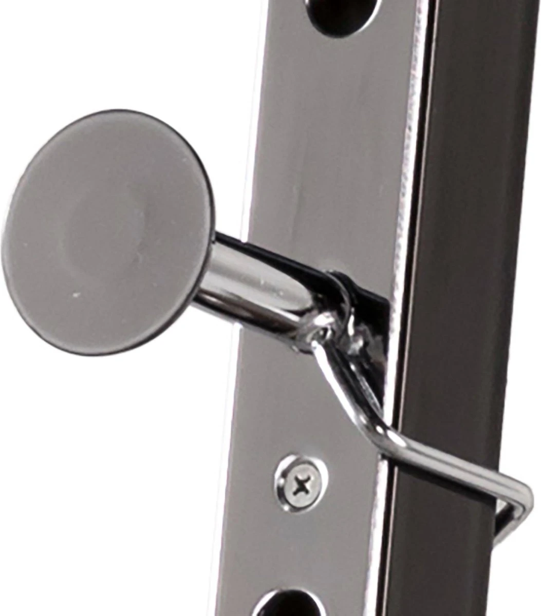Voor de veiligheid staat het squat rack enigszins schuin naar achteren, zodat de halter niet naar voren rolt. Extra veiligheid wordt geleverd door de veiligheidslinks, waarmee je de steunen vastzet aan het rek. Het squat rack is van staal en voorzien van een matzwarte poedercoating. Aan de voorzijde is een chroomlaag aangebracht om lakschade te voorkomen. Bij het Tunturi WT40 Squatrek worden 2 haltersteunen meegeleverd. Extra steunen kun je los bijbestellen.